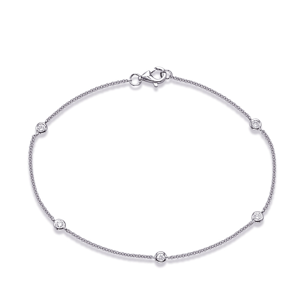 This bracelet is available in 14K White Gold. There are a total of 5 stones. There are round diamonds with a total carat weight of 0.14ct set in a Bezel Set setting