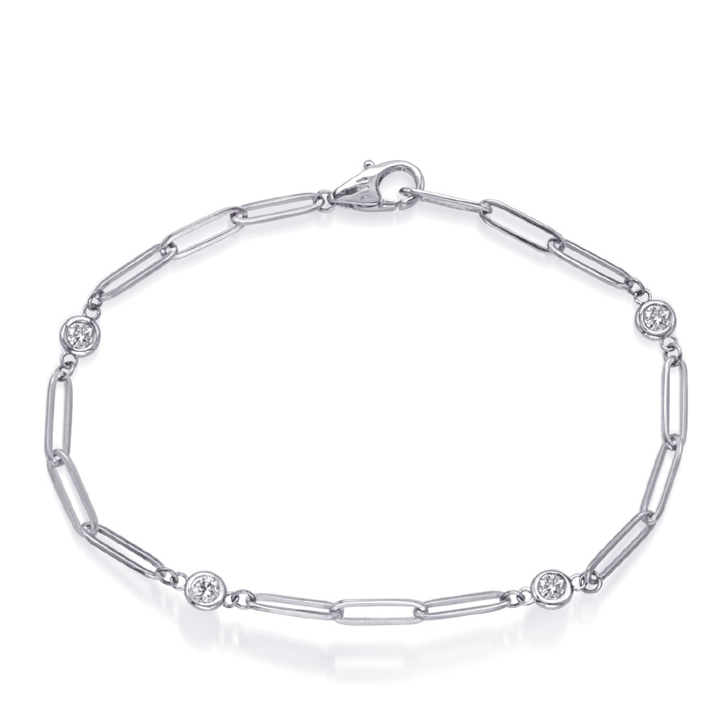 This bracelet is available in 14K White Gold. There are a total of 4 stones. There are round diamonds with a total carat weight of 0.34ct set in a Bezel Set setting