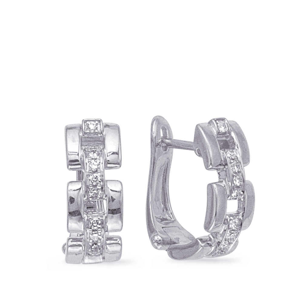These earrings are available in 14K White Gold. There are a total of 18 stones. There are round diamonds with a total carat weight of 0.15ct set in a Prong Set setting