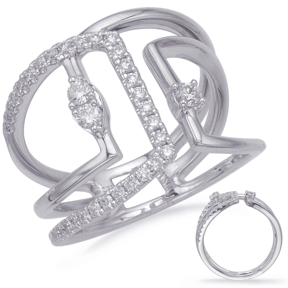 This fashion diamond ring is available in 14K White Gold. There are a total of 34 stones. There are round diamonds with a total carat weight of 0.38ct set in a Micro Prong / Prong Set setting