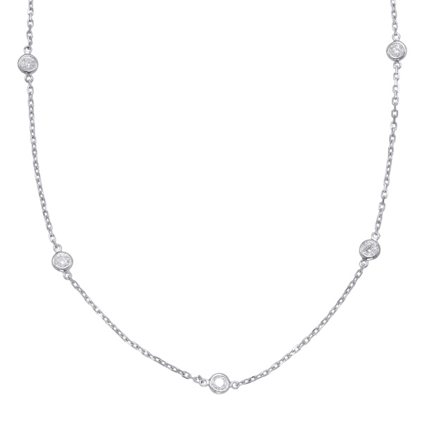 This necklace is available in 14K White Gold. There are a total of 10 stones. There are round diamonds with a total carat weight of 1.22ct set in a Bezel Set setting