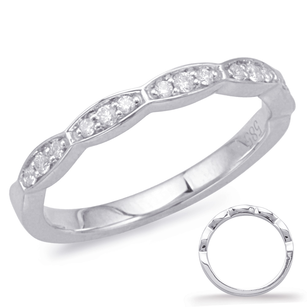 This band is available in 14K White Gold. There are a total of 15 stones. There are round diamonds with a total carat weight of 0.15ct set in a Micro Prong / Shared Prongs setting