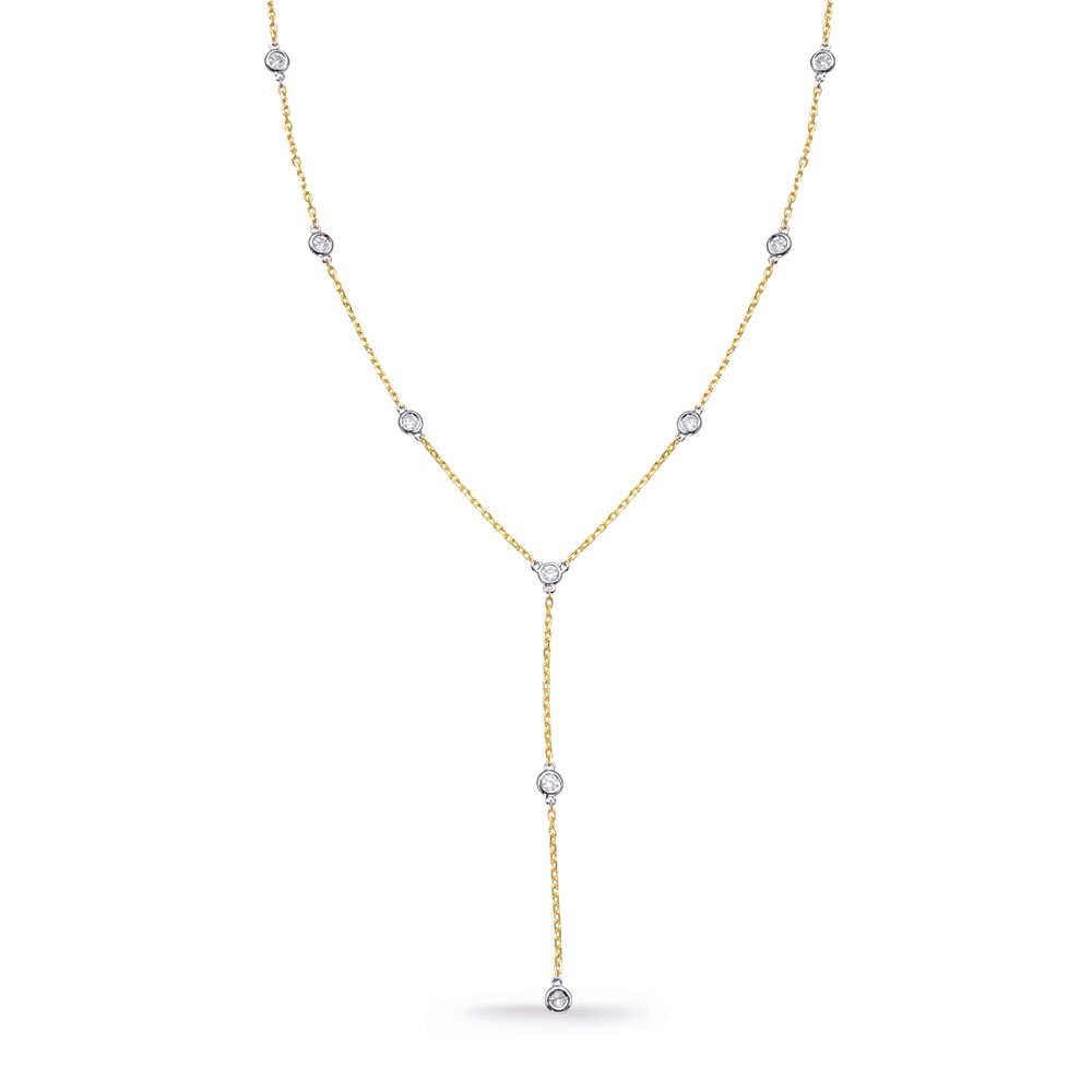 This necklace is available in 14K Yellow and White Gold. There are a total of 9 stones. There are round diamonds with a total carat weight of 0.52ct