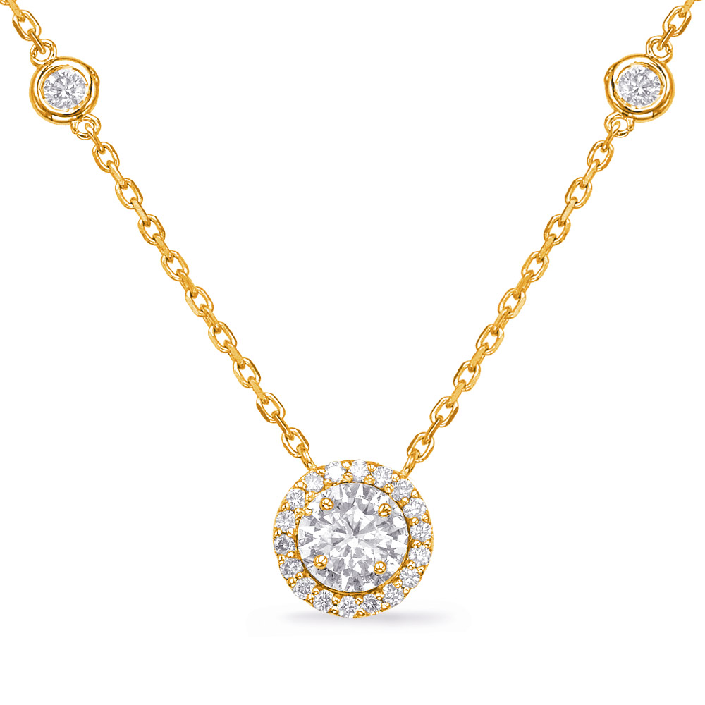 This necklace is available in 14K Yellow Gold. There are a total of 25 stones. There are round diamonds with a total carat weight of 0.53ct